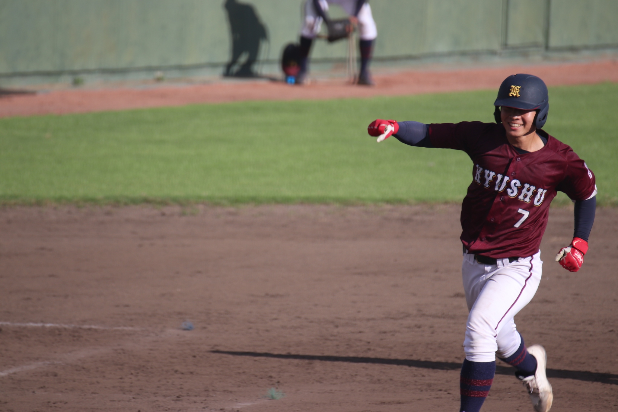 反撃したい九大は3回、1アウトから冨永(③宇土)が四球で出塁すると、続く谷口(③鳥取西)がレフトポール際へホームランを放ち、同点に追いつく。